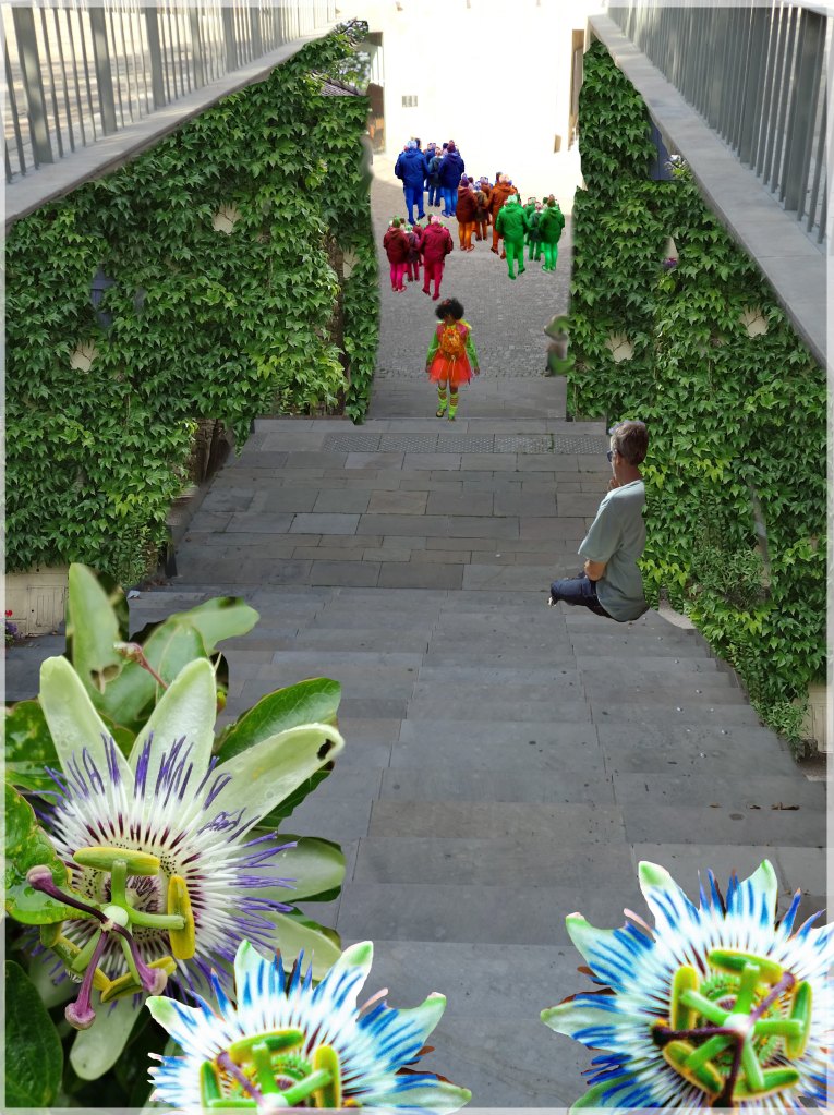Mylène à Caumont, lors de la visite de l’exposition sur Colin Vabrasa.Dans le passage Agard, retour de Jade et Mylène après le concert de Glori@Marseille.Jade se rend à la bibliothèque Douanier Rousseau par le chemin des passerelles -extension du PNU voulue par Nicolas Memain du Bureau des Guides-.Jade lors du défilé au Voûtes, rue d’Italie.Glori@Queen en concert avec le costume de la chanson I care.Mylène devant leur fief de la rue Joseph Cabassol.Jade recherche Papillon, le hacker rencontré sur le toit jardiné de la Halle aux grains.Bergerie de la chapelle des Oblats, Jade prend son service en tant que bergère remplaçante avec Pix.La star à avatars Glori@Queen.Jade rejoignant Org à la pause, le jour où elle aide à monter les décors de l’Hiver d’Orphée au GTP.